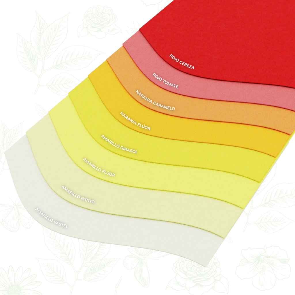 Papeles teñidos en su pasta, lo que significa que el color se integra completamente en la fibra, asegurando uniformidad en bordes, cantos y esquinas, brindando cortes y plegados perfectos, además de una mayor durabilidad y resistencia. Con tonos cálidos como rojos, rosas, naranjas y amarillos, son ideales para proyectos que transmiten energía y calidez.
