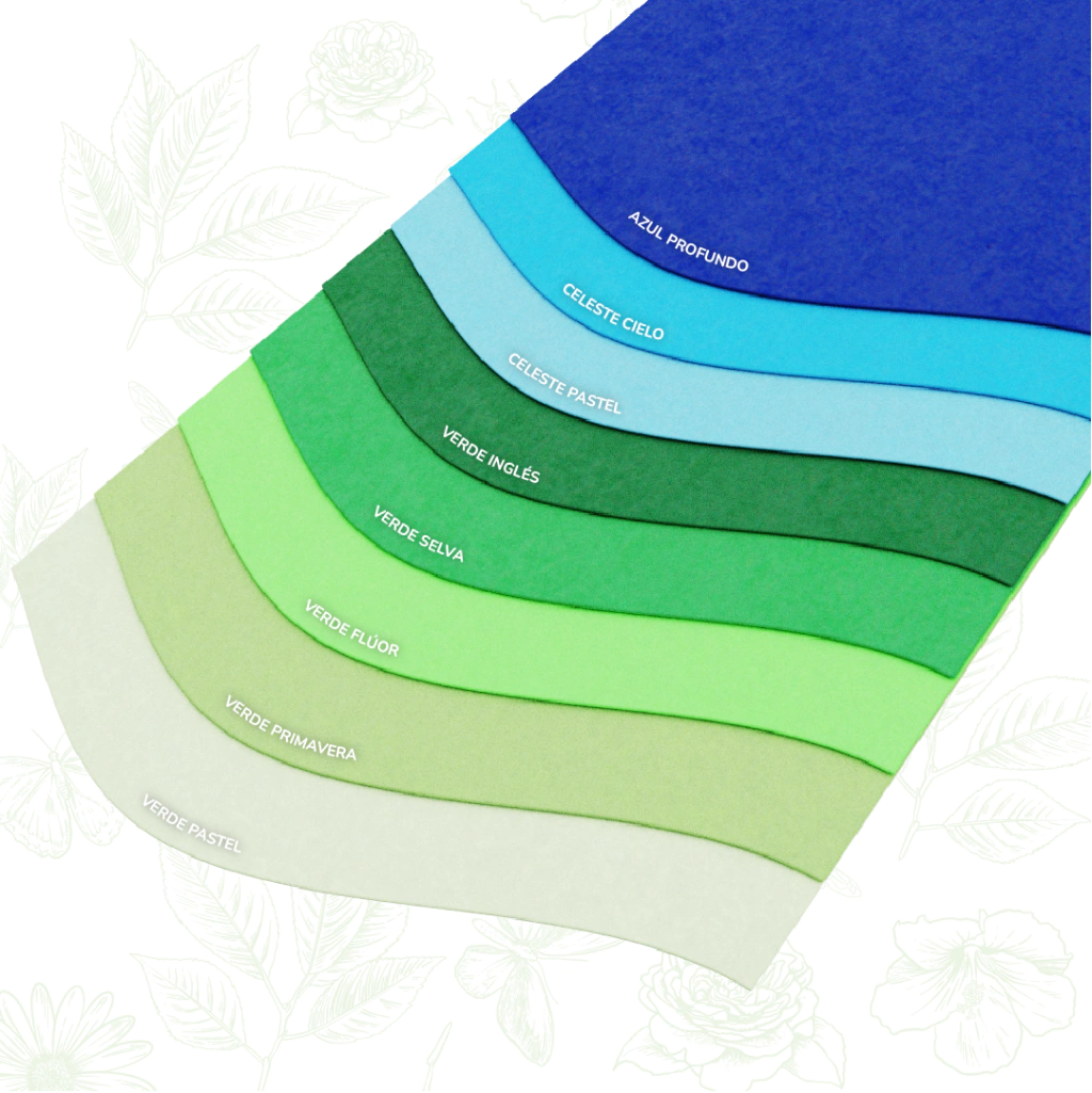 Papeles teñidos en su pasta, lo que significa que el color se integra completamente en la fibra, asegurando uniformidad en bordes, cantos y esquinas, brindando cortes y plegados perfectos, además de una mayor durabilidad y resistencia. Con tonos relajantes como azul, verde y violeta, son perfectos para trabajos elegantes.